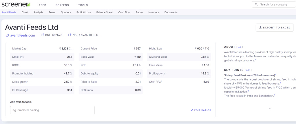 Once you login, you will see a page as shown below. To the top right, you will see a text box to search for a company. Here you can type in the company name. Let’s take the example of Avanti feeds. I will leave it to you to figure out how to register 🙂